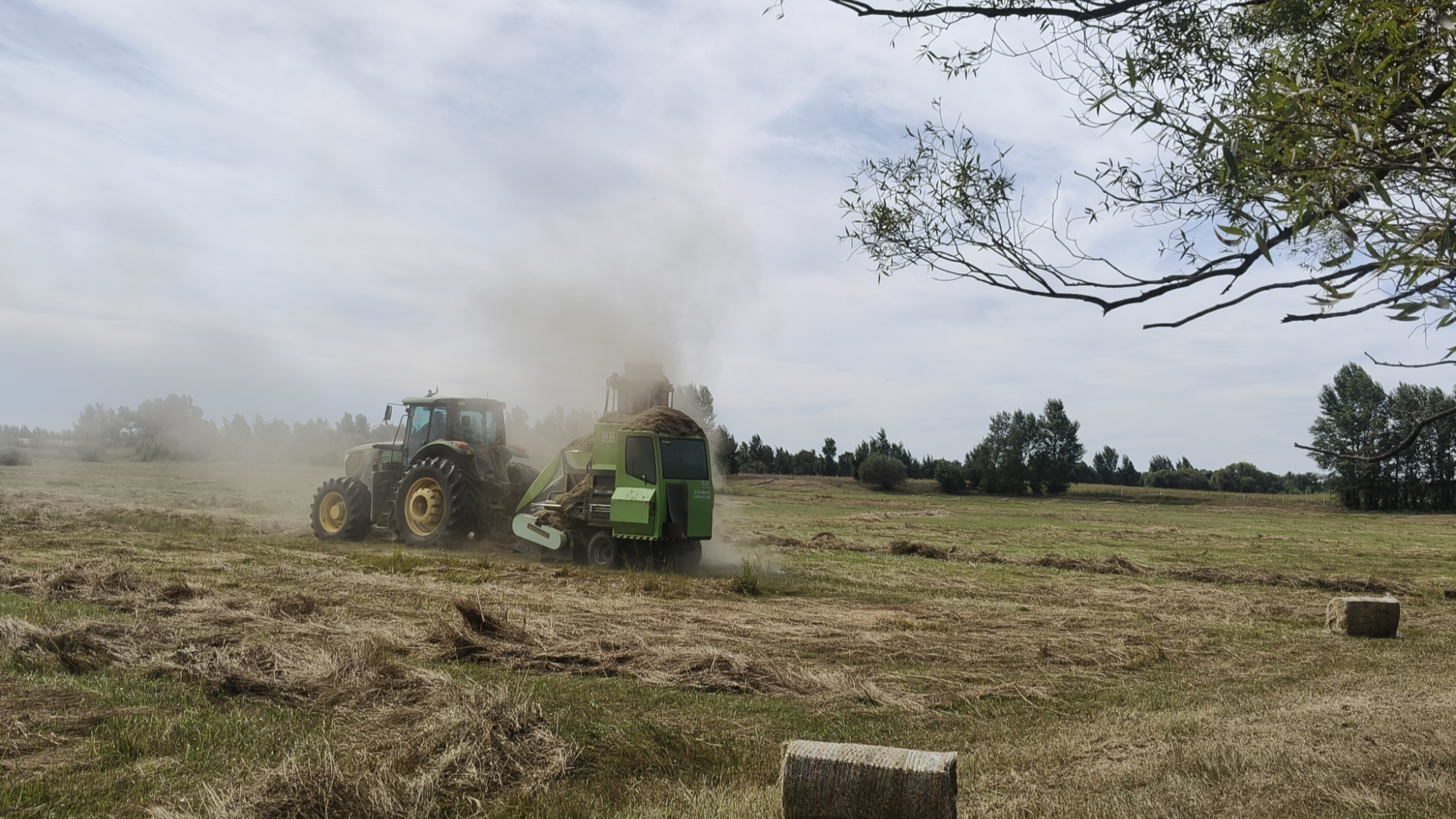 院子里青贮储藏紧锣密鼓,牧场上的牧草收割相同如火如荼。9月18日,在库伦旗茫汗苏木白音好来嘎查沙日好来小组的千亩团体牧场上,搂草机、捆草机来往络绎,牧草被收割、压缩成一个个紧实的草捆,摆放在草地上。这片牧场由嘎查团体一致管理、一致收割,本年长势喜人,为沙日好来小组3000多头家畜的饲草储藏供给了重要支撑。茫汗苏木白音好来嘎查“两委”成员白淑琴说:“这是天然草牧场,大概有900多亩,依照人口分的话,沙日好来小组一口人能分到2.4亩,出青草是40万斤左右,再加上老百姓自家的青贮、秸秆,牛羊能够顺畅过冬。”